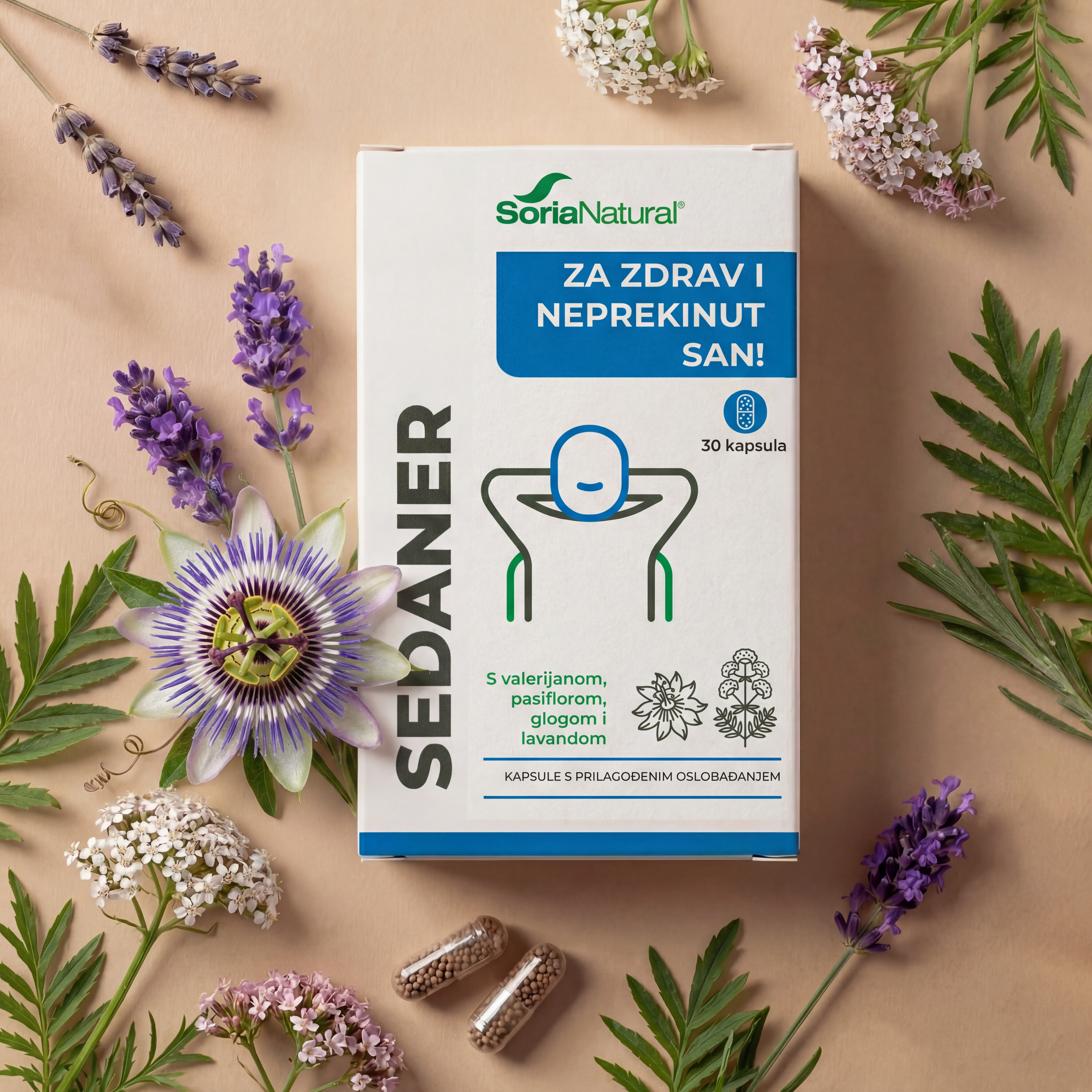 Dodatak prehrani u obliku kapsula s prilagođenim oslobađanjem na bazi odoljena (Valeriana officinalis L.), pasiflore (Passiflora incarnata L.), crvenog gloga (Crataegus oxyacantha Auct.) i eteričnog ulja cvijeta lavande (Lavandula angustifolia Miller).