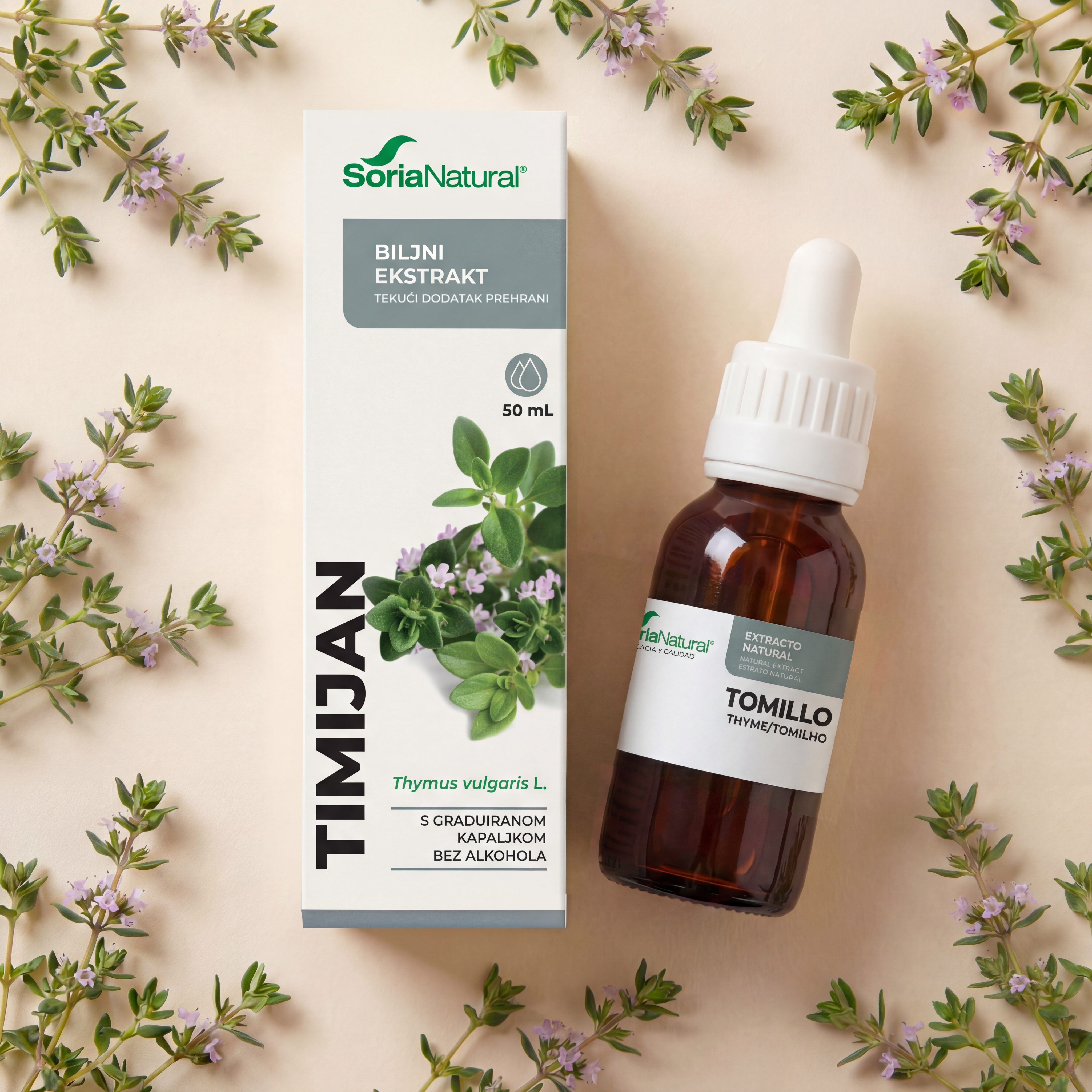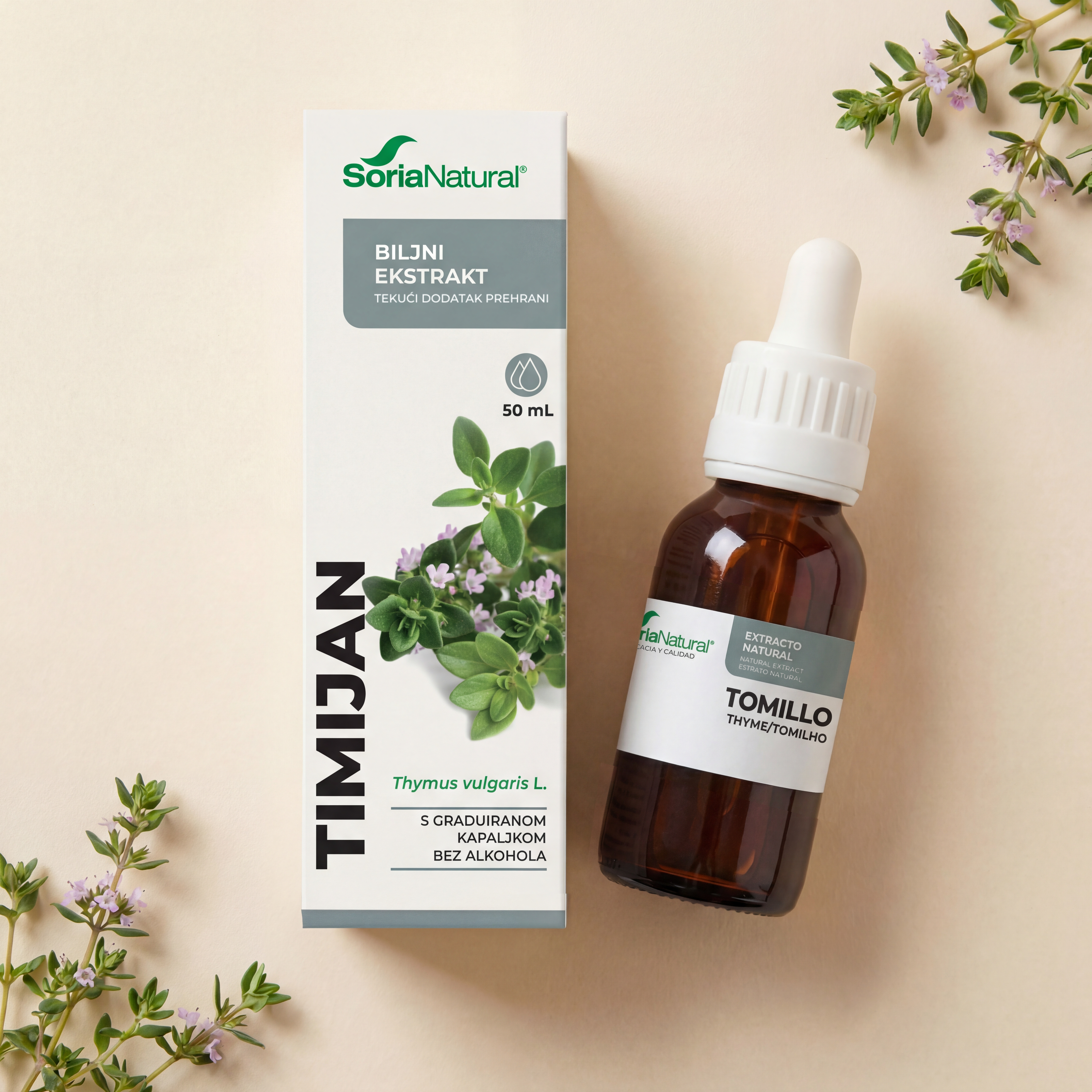 Tekući dodatak prehrani s koncentriranim ekstraktom listova timijana (Thymus Vulgaris L.) u biljnom glicerolu.